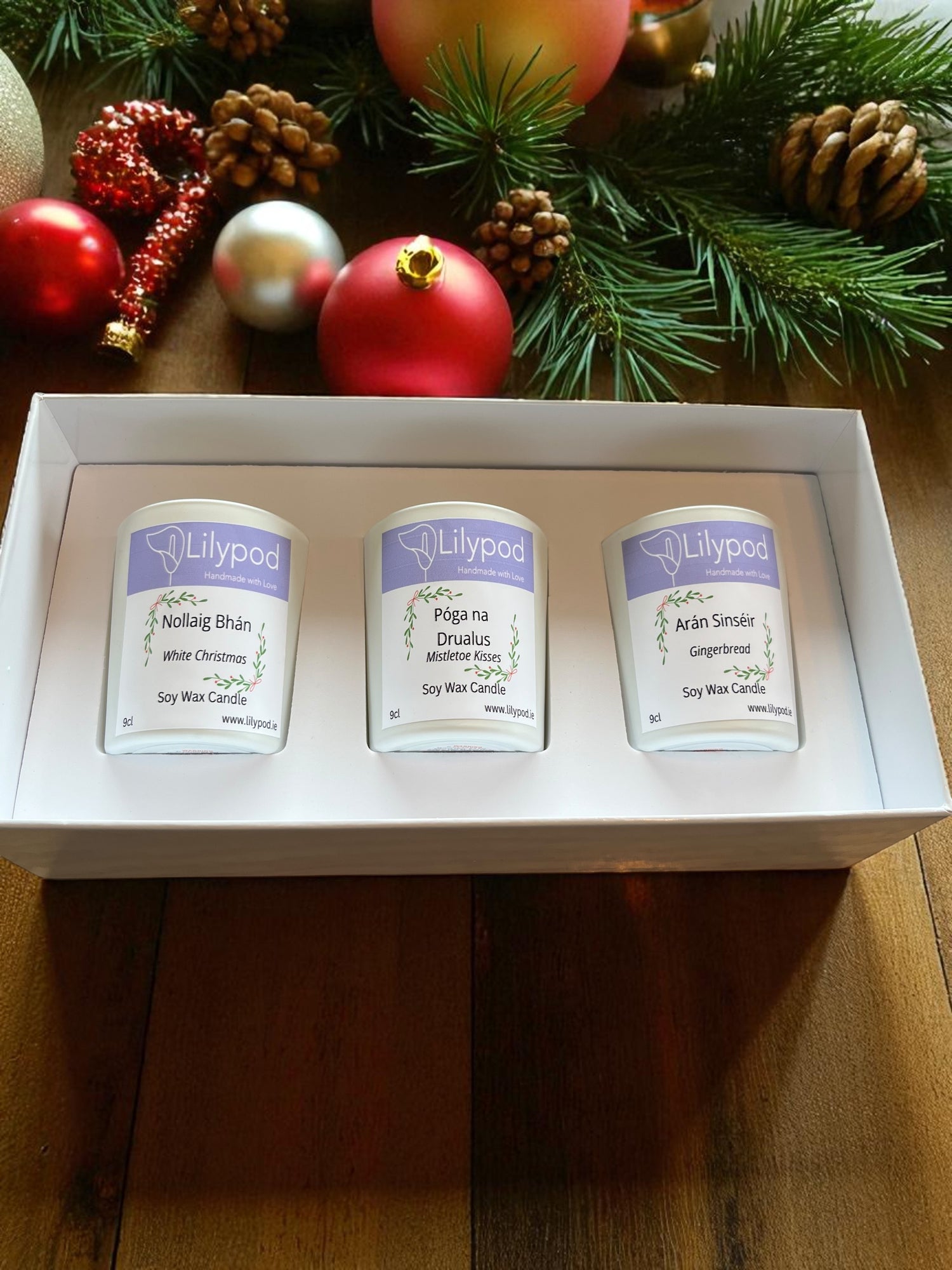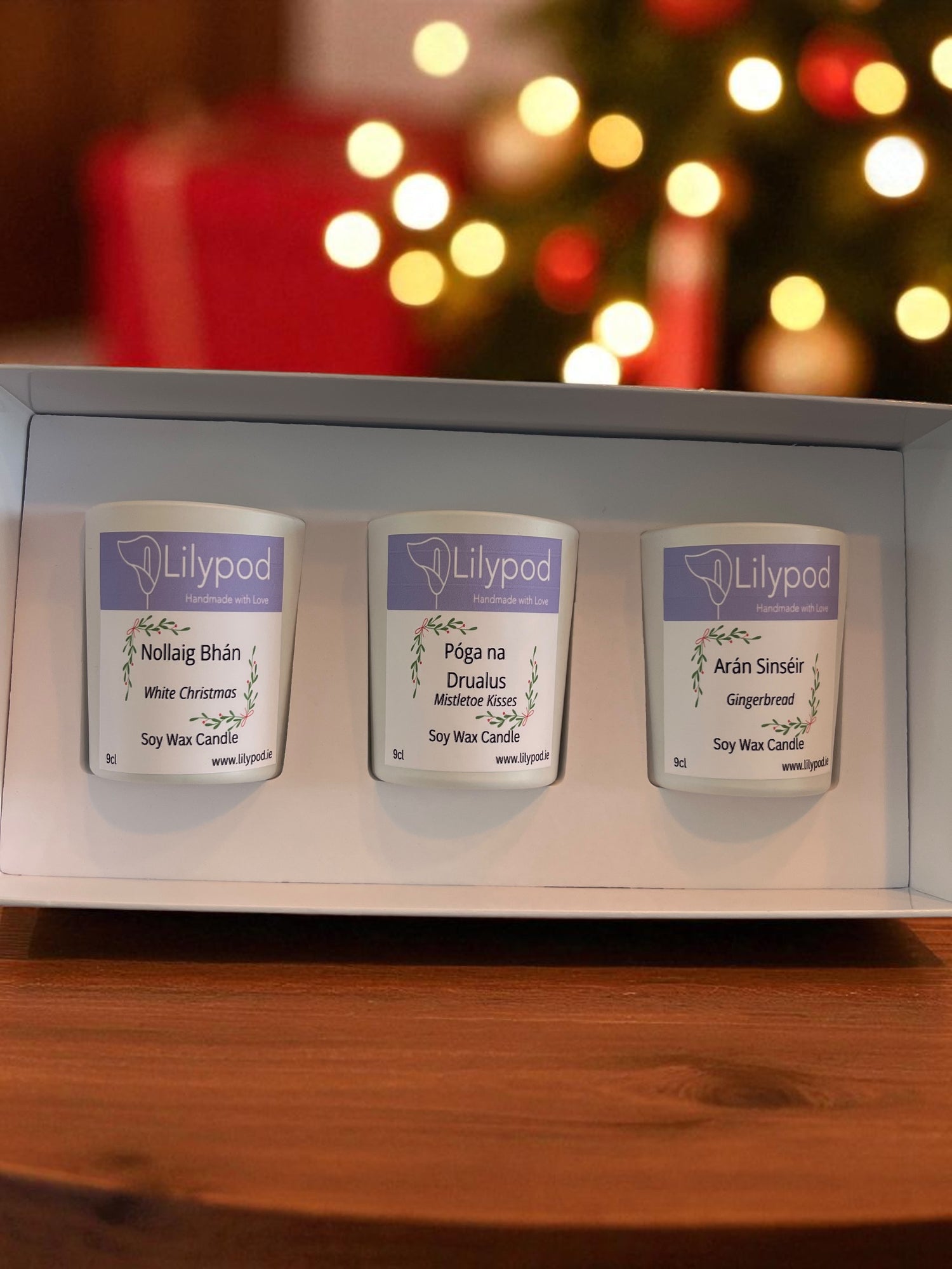 Give the gift of warmth and aroma this festive season with our Christmas Candle Trio. Choose any three from our four seasonal scents — Spíosra na Nollag (Christmas Spice), Arán Sinséir (Gingerbread), Póga na Drualus (Mistletoe Kisses), and Nollaig Bhán (White Christmas).