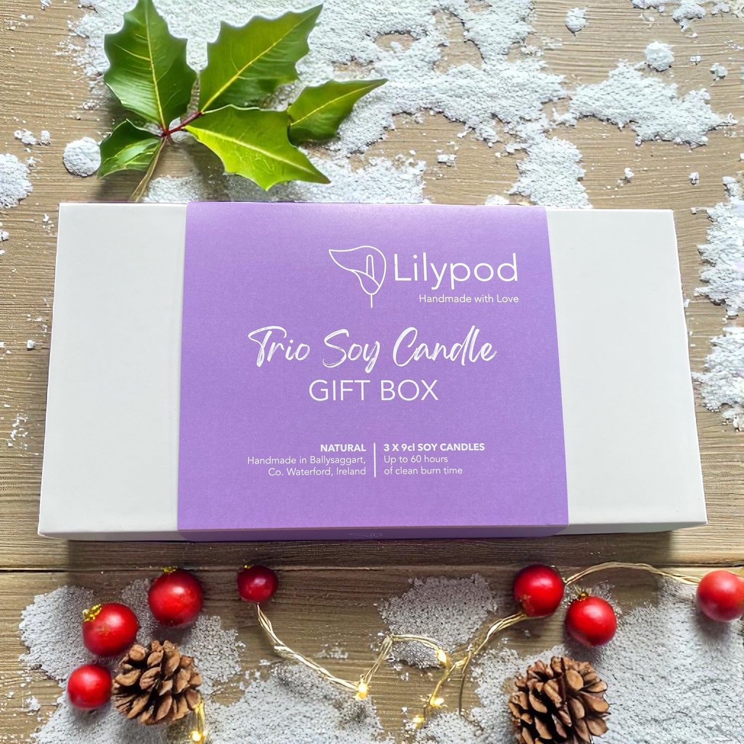 Tá gach coinneal lámhdhéanta as céir shóighe nádúrtha, ag tairiscint lasadh glan, fada buan. Cuirtear an tríréad i láthair go hálainn i mbosca bronntanais bán sómhara, rud a fhágann gur bronntanas Nollag foirfe é do dhuine grá – nó mar chóireáil speisialta duit féin.